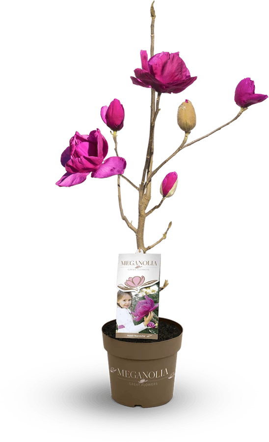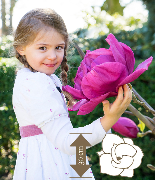 Meganolia® impresses with giant, globe-shaped flowers of up to 30 cm, in an intense pink shade, appearing even before the leaves. They give your garden a spectacular look in early spring (March–April). Thanks to its robust, winter-hardy character (down to approx. –35 °C) and wind-resistant blooms, this striking effect lasts for a long time – all with low maintenance and excellent pruning tolerance.