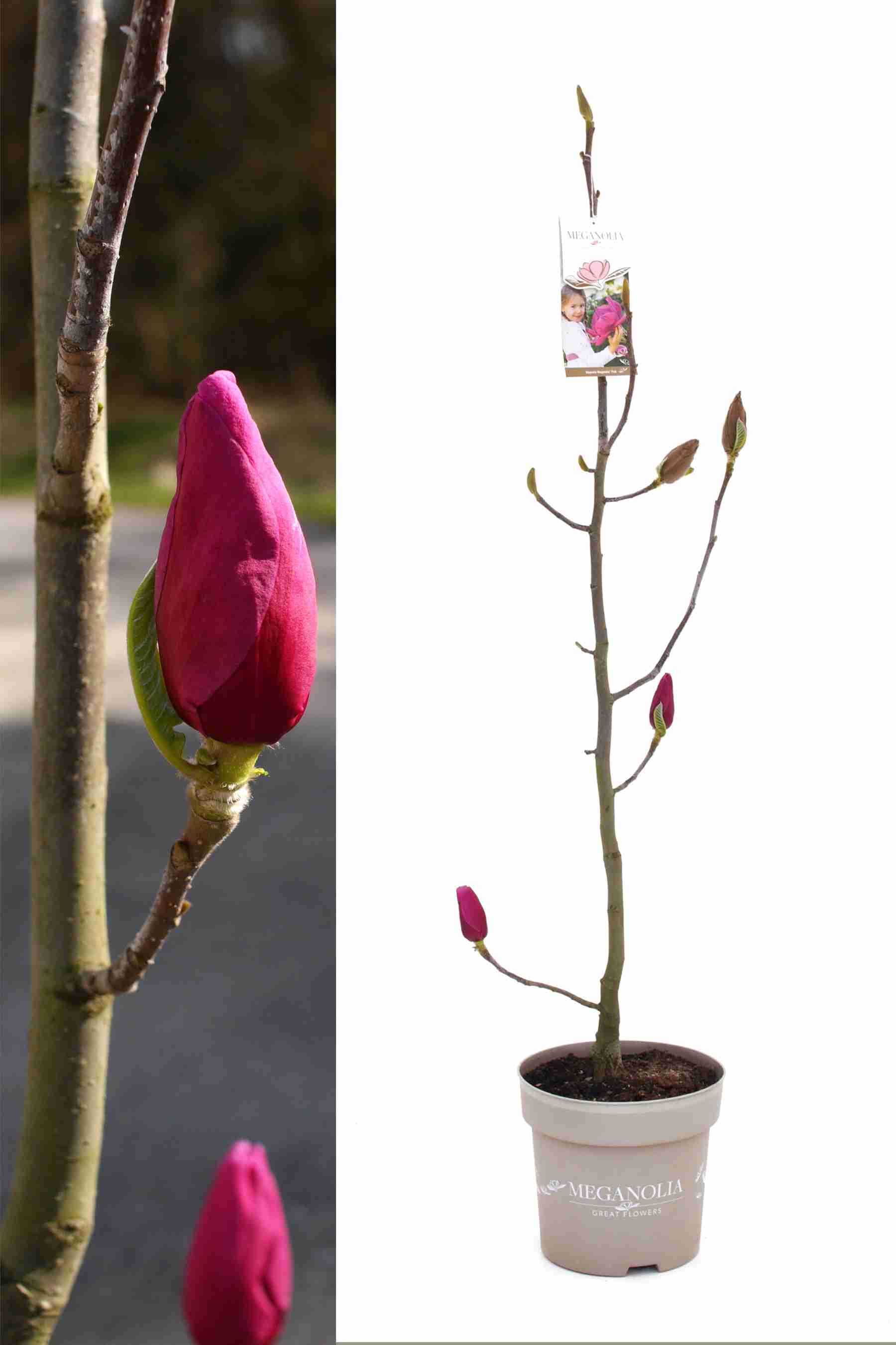 Meganolia® impresses with giant, globe-shaped flowers of up to 30 cm, in an intense pink shade, appearing even before the leaves. They give your garden a spectacular look in early spring (March–April). Thanks to its robust, winter-hardy character (down to approx. –35 °C) and wind-resistant blooms, this striking effect lasts for a long time – all with low maintenance and excellent pruning tolerance.